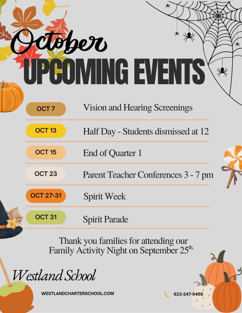 • October 31 – Spirit Parade. Families welcome to come watch. Time will be announced in the next 2 weeks.